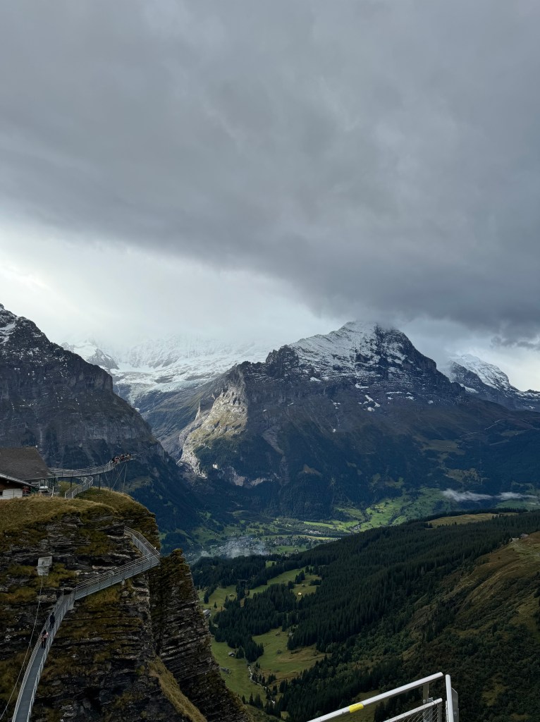 When we arrived in Grindelwald, we made our way to the gondola lift station to First. This was a big bucket list item for me. I had seen photos of the famous hikes at the top of First. We rode the Gondola to the top of the mountain which took about 25 minutes. This experience gave us 360 degree views of all the mountains surrounding us.