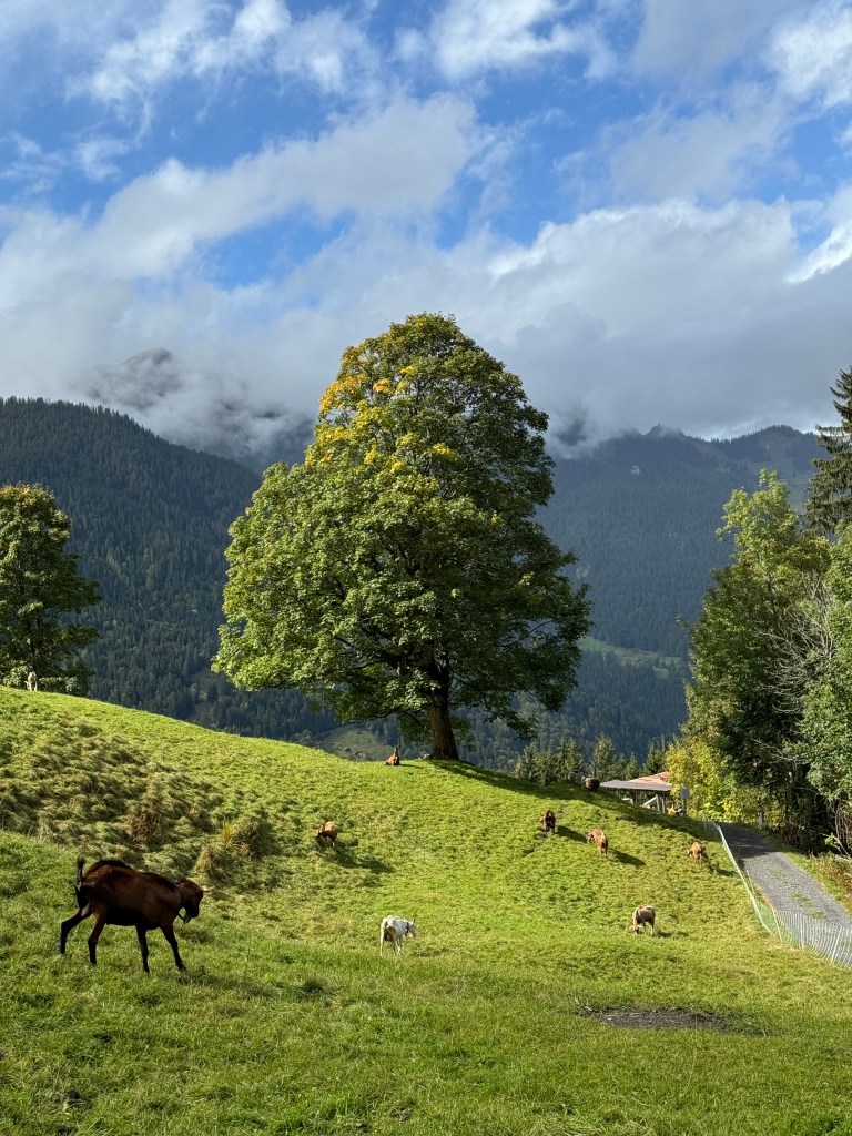 We ended up stumbling upon a 9 mile hike (we didn’t realize the length when we started it) that took us up along one of the canyons and gave us great views of Lauterbrunnen below. Along this hike, we walked through smaller mountain towns and saw more wildlife. One of my favorite scenes was a beautiful tree that stood alone on the mountain with goats grazing below it. The start of this hike was constantly uphill for the most part, but we eventually started our decline and ran right into the train station.